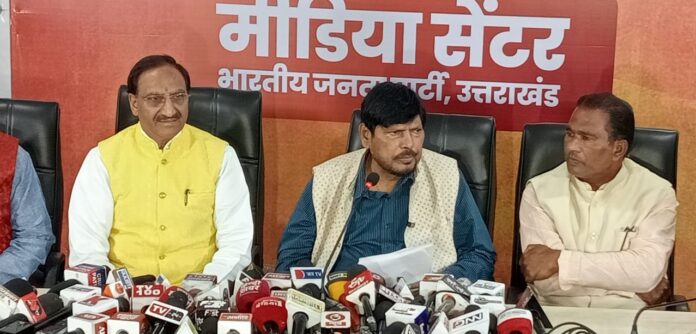 अठावले ने रिपब्लिक पार्टी ऑफ इंडिया के अध्यक्ष होने के नाते दलित समाज और अपने कार्यकर्ताओं से मोदी को तीसरी बार प्रधानमंत्री बनने के लिए भाजपा के कंधे से कंधा मिलाकर काम करने का आह्वान किया। उन्होंने दलित समाज को याद दिलाया कि चुनाव हारने के बाद किस तरह यूपीए सरकार ने सरकारी आवास से उनके सामान को भगवान बुद्ध की मूर्ति और संविधान की कृतियों के साथ सड़क पर फेंका था। उन्होंने कहा जिस कांग्रेस ने मेरा सामान बाहर निकाला, उसे मैं सत्ता से बाहर निकले रखने का संकल्प लिए हुआ है। उन्होंने मुस्लिम समाज में फैलाई जा रहे भ्रम को लेकर स्पष्ट किया कि केंद्र एवं राज्य सरकार की सभी योजनाएं सर्व धर्म, सर्व समाज सम्भाव के अनुशार संचालित की जा रही है लिहाजा अल्पसंख्यक समाज के लोगों को भ्रम में आने की कतई जरूरत नहीं है। उन्होंने प्रदेश के दलित एवं पिछड़े वर्ग से भाजपा के उम्मीदवारों को समर्थन देने का अनुरोध किया। धामी सरकार के कामों की प्रशंसा करते हुए कहा कि प्रधानमंत्री मोदी के मिशन का उत्तराखंड में वह बखूबी निर्वहन कर रहे हैं। यूसीसी लागू करने को लेकर उन्होंने कहा, पिछड़ों की सुरक्षा एवं अल्पसंख्यक समाज में महिलाओं के अधिकारों के हित में यह बहुत बड़ा निर्णय है। इसी तरह त्रिवेंद्र रावत सरकार में सभी कार्यालय में भारत रत्न बाबासाहेब भीमराव अंबेडकर का चित्र लगाने का शासनादेश करने वाला पहला प्रदेश होने का भी जिक्र कर प्रशंसा की। श्री अठावले ने एनडीए के लक्ष्य पर जोर देते हुए कहा अबकी बार 400 पार फिर एक बार मोदी सरकार और कांग्रेस नहीं कर पाएगी 40 बार। क्योंकि पिछली बार कांग्रेस को केरल ने बचा दिया था जहां उन्होंने 19 लोकसभा सीट प्राप्त की थी । लेकिन इस बार मोदी जी के नेतृत्व में एनडीए दक्षिण का किला भी फतह करने वाला है। पत्रकार वार्ता में पूर्व मुख्यमंत्री डॉक्टर रमेश पोखरियाल निशंक, प्रदेश मीडिया प्रभारी मनवीर चैहान, प्रदेश प्रवक्ता सुरेश जोशी, विधायक खजान दास, प्रदेश उपाध्यक्ष देशराज कर्नवाल, राजेंद्र नेगी, मानिक निधि शर्मा, सुनीता विद्यार्थी, हनी पाठक, कमलेश रमन प्रमुख रूप से मौजूद रहे।