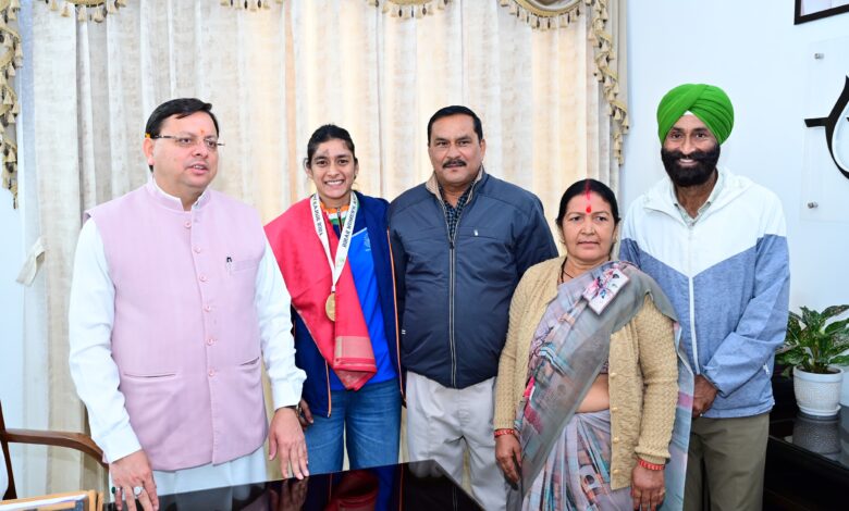 देहरादून। मुख्यमंत्री पुष्कर सिंह धामी से रविवार को मुख्यमंत्री आवास में एशियाई चौंपियंस ट्रॉफी विजेता महिला हॉकी टीम की सदस्य हरिद्वार निवासी मनीषा चौहान ने शिष्टाचार भेंट की। इस दौरान मनीषा के साथ उनके माता पिता एवं कोच भी मौजूद रहे।